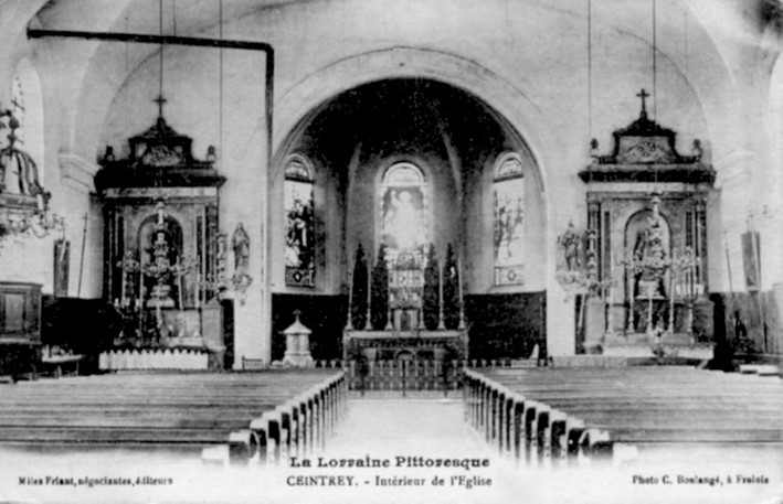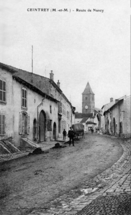 Les communes de la Meurthe, journal historique des villes, bourgs, villages, hameaux et censes de ce département, par Henri Lepage. 1853. Etienne de Ceintrey (Stephanus de Synterei), Thomas et Richard, frères, du même lieu (de Sainteri), figurent comme témoins dans des chartes données à l'abbaye de Clairlieu par Pierre de Brixey, évêque de Toul (1183), et Simon II, duc de Lorraine (vers 1205). (Abb. de Clairlieu.) Le vendredi avant la Sainte-Marguerite 1350, Claire de Linanges, dame de Boulay, renonce, en faveur de sen cousin, Ferry de Linanges, aux villes et droitures de Haroué, Affracourt, Laneuveville et Ceintrey, qu'elle tenait de la duchesse Marie de Blois. (T. C. Nancy.) Le 3 juin 1426, Jean Farette d'Abocourt reconnaît devoir à Mahaut de Joinville, veuve d'Antoine de Ville, 80 francs qu'elle lui hypothèque sur sa part du château de Pulligny et des villes de Pulligny, Ceintrey, Voinémont, Ochey et Pierreville. (T. C. Nancy 6.) La terre de Ceintrey fut ensuite possédée, en partie, par différents seigneurs, qui en firent successivement foi et hommage au duc de Lorraine ; ce furent : Didier de Landres, chevalier (1471) ; Pierre d'Oriocourt (1482) ; Jean, comte de Salm, maréchal du duché de Bar (1487) ; Marguerite de Vaux, veuve de Nicolas de Pfaffenhoffen, laquelle avait acquis, en 1532, de Nicolas de Mercy, tout ce que celui-ci possédait à Thelod, Acraignes et Ceintrey ; Thierry Griffenetad, sieur de Hollensels (1546) ; Jacob du Bourg (1548) ; Jean Beaufort, seigneur de Pulligny (1558) ; Claude Le Clerc, valet de chambre de Charles III (1562) ; Nicolas Rousselot, seigneur d'Hédival, et Anne-Philippe Cueullet (1664) ; enfin, en 1668, Jean Bermand, receveur général de Lorraine, au nom d'Anne Bourgeois, sa femme. (T. C. Fiefs de Nancy et Vosges, Foug, etc.) La collation de la cure de Ceintrey appartenait au commandeur de Virrecourt ; le curé était collateur de la chapelle Sainte-Anne, située dans l'église ; cette dernière renfermait aussi une chapelle de Saint-Nicolas, fondée, on ne dit pas à quelle époque, par un nommé Jean Noël, dont la tombe se voyait dans la nef. Il y avait, dans le cimetière, et attenant à celle église, une chapelle de Notre-Dame-de-Pitié, fondée en 1564, par Thouvenin Marlier. Une confrérie de Sainte-Anne avait été érigée dans la paroisse de Ceintrey, le 4 juillet 1672, par M. du Saussay, évêque de Toul. Beaucoup de fondations pieuses y avaient également été faites à différentes époques : en 1635, Didier Poirel, maire de Saint-Firmin, avait fait don d'une somme de 50 francs barrois, dont la rente devait être affectée à l'achat du vin qui se distribuait aux communiants le jour de Pâques. (E. T. et cure de Ceintrey.) Ceintrey a été érigé en succursale en 1802. Patron, saint Remy. |